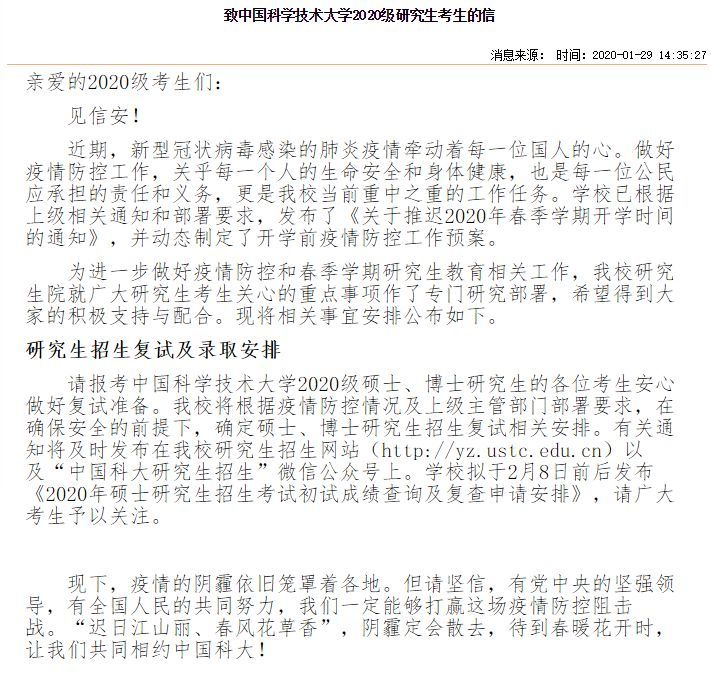 中国科学技术大学:校园拟于2月8日前后发布《2020年硕士研究生招生考试初试成果查询及复查请求组织》