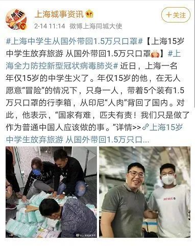 上海一名15岁的初二学生从国外独自扛回15000只口罩回国……