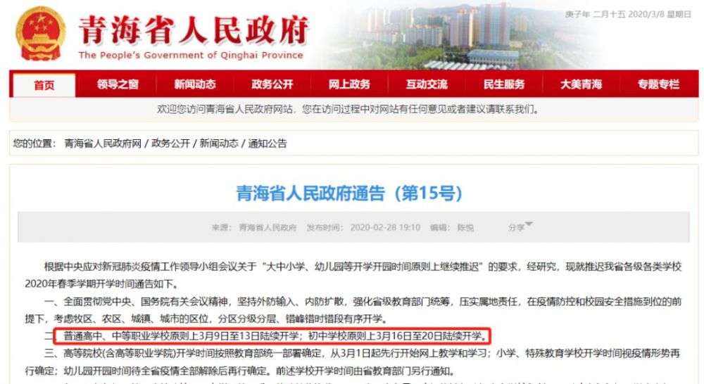 详细开学时刻,省委省政府将依据疫情防控状况科学研判后当令发布。