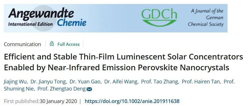 近年来,南京大学现代工程与使用科学学院邓正涛教授团队一向致力于新式发光量子点资料的根底研究和产业化使用。特别是在广色域显现器材和发电窗户两个方向,环绕量子点在实践使用中的瓶颈问题,在产品的使用形状、功能提高和耐老化方面取得了一系列发展。最近,该课题组选用一种新式的三苯基膦处理办法,制备了具有高光致发光量子功率、低重吸收、高稳定性的近红外发射铯铅碘量子点太阳能发电窗户原型器材。相关效果于2020年3月以“Efficient and Stable Thin‐Film Luminescent Solar Concentrators Enabled by Near‐Infrared Emission Perovskite Nanocrystals”为题在世界尖端化学期刊《Angewandte Chemie International Edition》《德国使用化学》杂志上在线宣布(doi:10.1002/201911638)。
