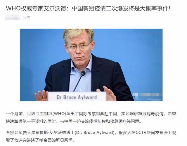 布鲁斯·艾尔沃德为现任世界卫生组织助理总干事,流行病学专家和应急专家,兼联合专家调查组外方组长。2月24日,在我国-世卫新冠肺炎联合专家调查组的新闻发布会上,布鲁斯·艾尔沃德对我国关于疫情防控的做法给予活跃点评,而网传文章中说布鲁斯·艾尔沃德以为我国疫情防控“扶摇直上”。