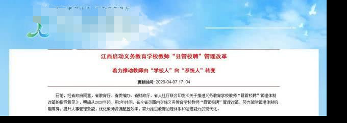 2020年,中心一号文件明确指出,全面推行责任教育阶段教师“县管校聘”,有方案组织县城校园教师到村庄支教。依据这一精力,许多当地拟定相关方针,责任教育阶段的教师,本年开端面临全面推行”县管校聘“方针的影响。